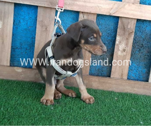 این توله دوبرمن زیبا که میبینید کاملا غذاخور شده و خیلی بازیگوشه . رنگ بلوطی بسیار عالی و پوشش مویی کاملا چرمی داره . تا چند روز دیگه هم نوبت زدن اولین واکسنش میشه و بعد از اون میتونید شناسنامش رو بنام خودتون از دست دامپزشک تحویل بگیرید. برای دریافت اطلاعات بیشتر با من تماس بگیرید.