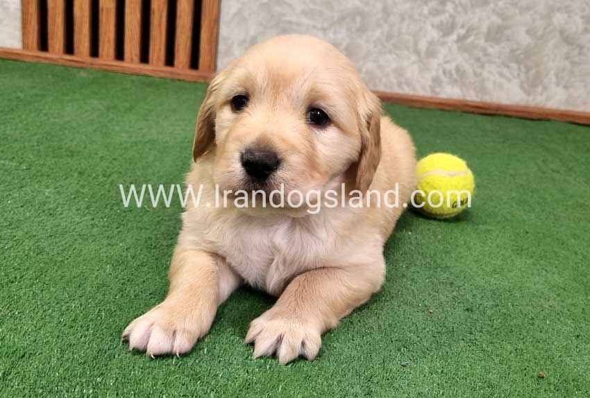 این توله گلدن طلایی کوچولو حدود 50 روز سن داره. جنسیتش نر هست و بتازگی غذاهای رقیق مثل ماست رو میتونه بتنهایی بخوره. پوشش مویی فوق العاده زیبا و پوزه ی پهن و عالی ای داره.